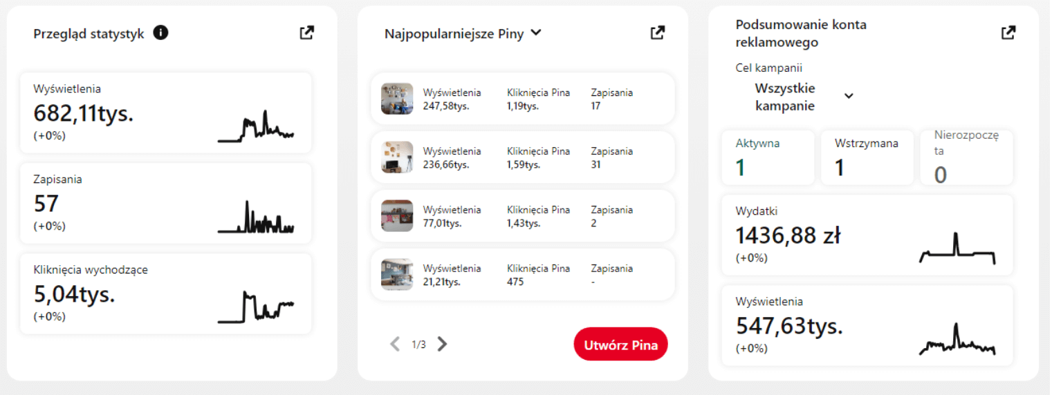 Monitorowaliśmy więc kliknięcia w aktywny numer telefonu na stronie, uznając to za kluczowy wskaźnik zaangażowania i chęci zakupu. W okresie przed integracją Pinteresta odnotowaliśmy zaledwie 3 kliknięcia w numer telefonu. Po uruchomieniu nowej strategii, liczba ta skoczyła do 109 w ciągu dwóch miesięcy! To jest dowód, że nasza kampania nie tylko generowała sprzedaż, ale przede wszystkim budowała zaufanie i kontakt z doradcą, co w branży wnętrzarskiej jest często najkrótszą drogą do finalizacji zamówienia.