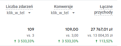 Liczba kliknięć w numer telefonu oraz przychody z 2 ostatnich miesięcy