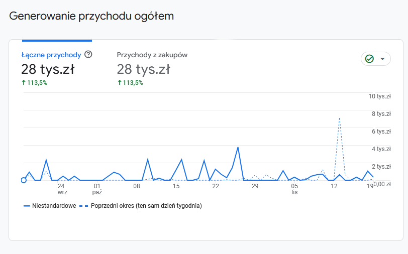 Kiedy już połączyliśmy siły Google i Pinteresta, efekty przerosły oczekiwania. Porównaliśmy sprzedaż z 2 miesięcy po uruchomieniu zintegrowanej strategii, z okresem, w którym polegaliśmy tylko na klasycznym Google Ads. Rezultat? Przychody poszybowały w górę o oszałamiające 113,5%!